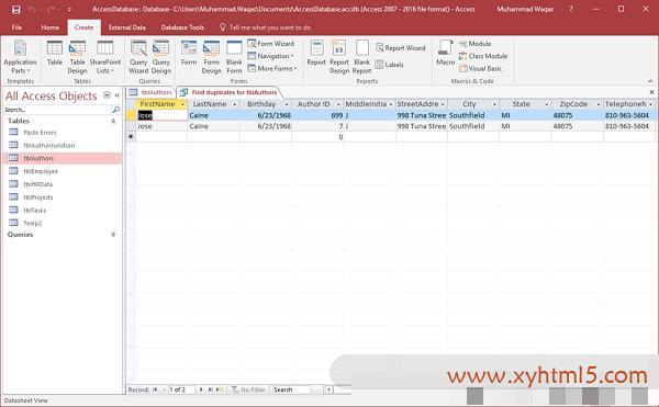 在这里,Access找到了可能重复,这将是作者Jose Caline,它具有相同的生日,相同的地址,相同的电话号码但不同的AuthorID.