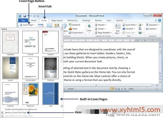 第1步 : 单击插入选项卡,然后单击页面组中的封面按钮.这将显示内置封面页面列表,如下所示.您可以在封面库底部找到删除当前封面选项.