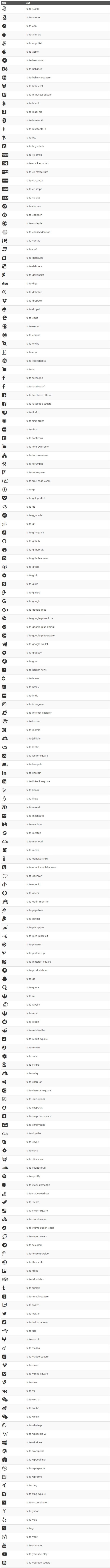 下表显示了所有的 Font Awesome 品牌图标: