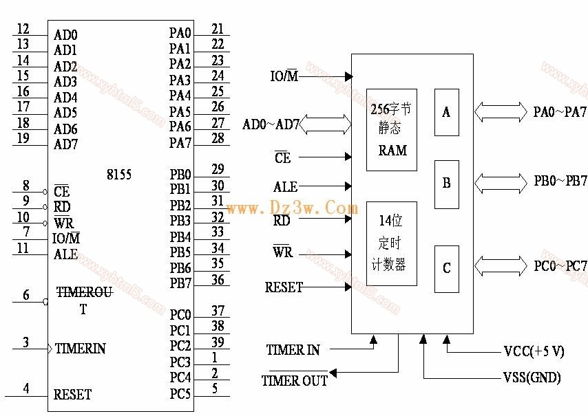 8155有40个引脚,采用双列直插封装,其引脚图和组成框图如下页图所示。
