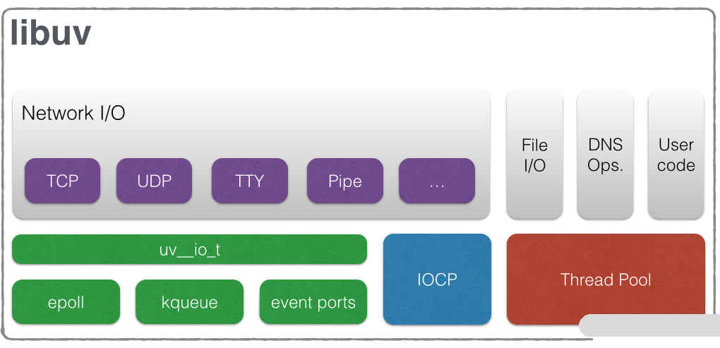 我直接这么说概念你可能也不太懂。可以暂时知道 Windows 下注意通过 IOCP 来向系统内核发送 I/O 调用和从内核获取已完成的 I/O 操作,配以事件循环,完成异步 I/O 的过程。在 linux 下通过 epoll 实现这个过程,也就是由 libuv 自行实现。