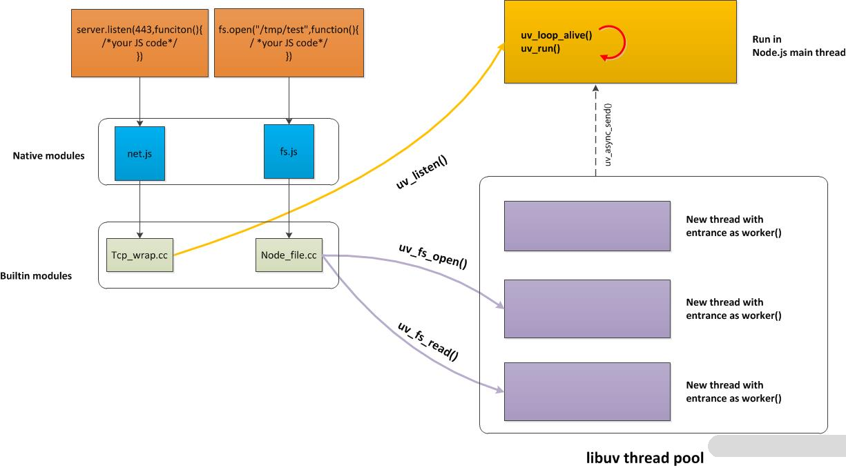 重要:虽然 libuv 的异步文件 I/O 操作是通过线程池实现的,但是网络 I/O 总是在单线程中执行的,注意最后还是会把完成的内容作为事件加入事件循环,事件循环就和文件 I/O 相同了。