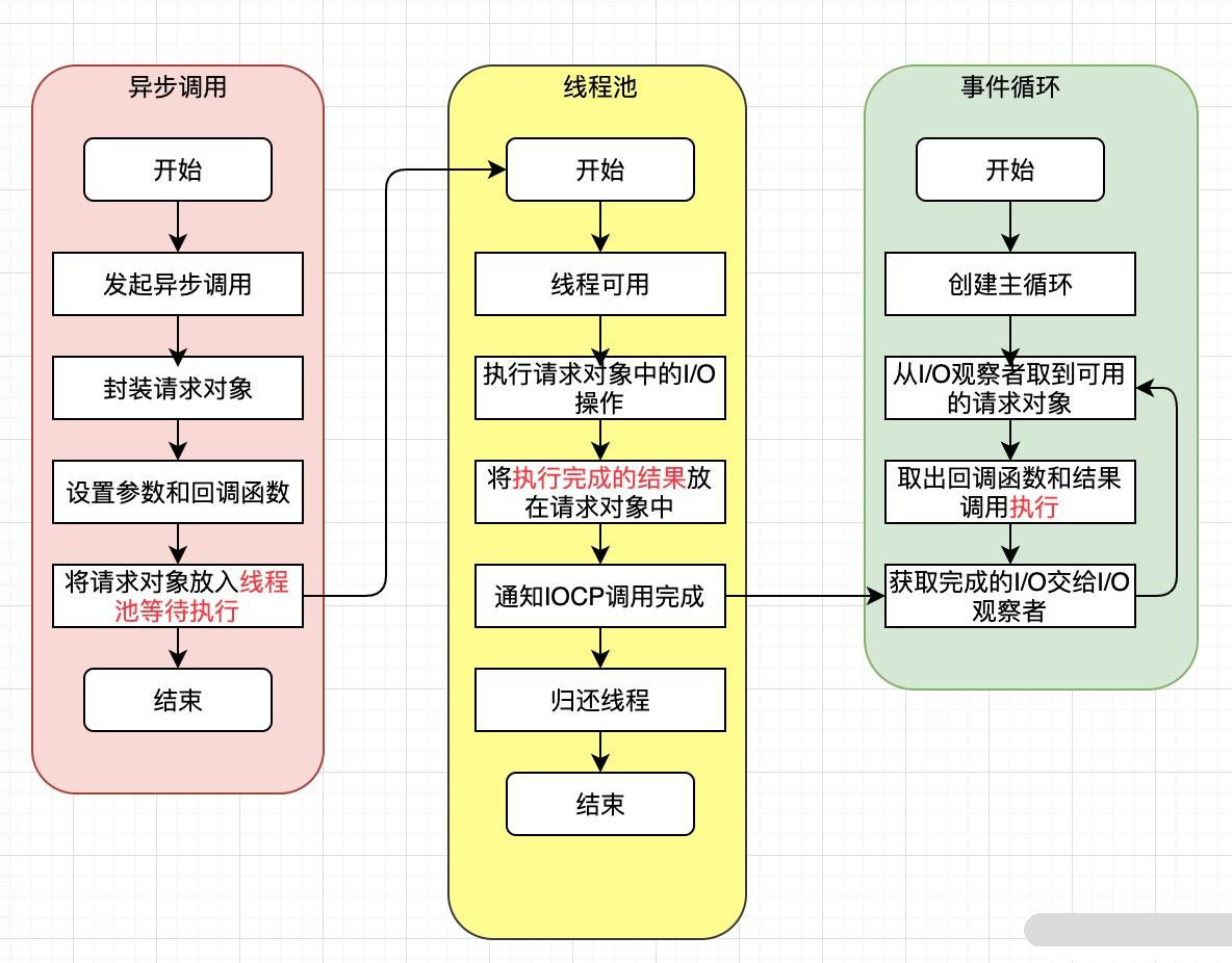 在这整个过程中,进程初期创建的事件循环中有一个 I/O 观察者,每次 Tick 的执行中,它会调用 IOCP 相关的方法检查线程池中是否有执行完成的请求,如果存在,会讲请求对象和之前绑定的 result 属性,加入到 I/O 观察者的队列中,然后将其当作事件处理。